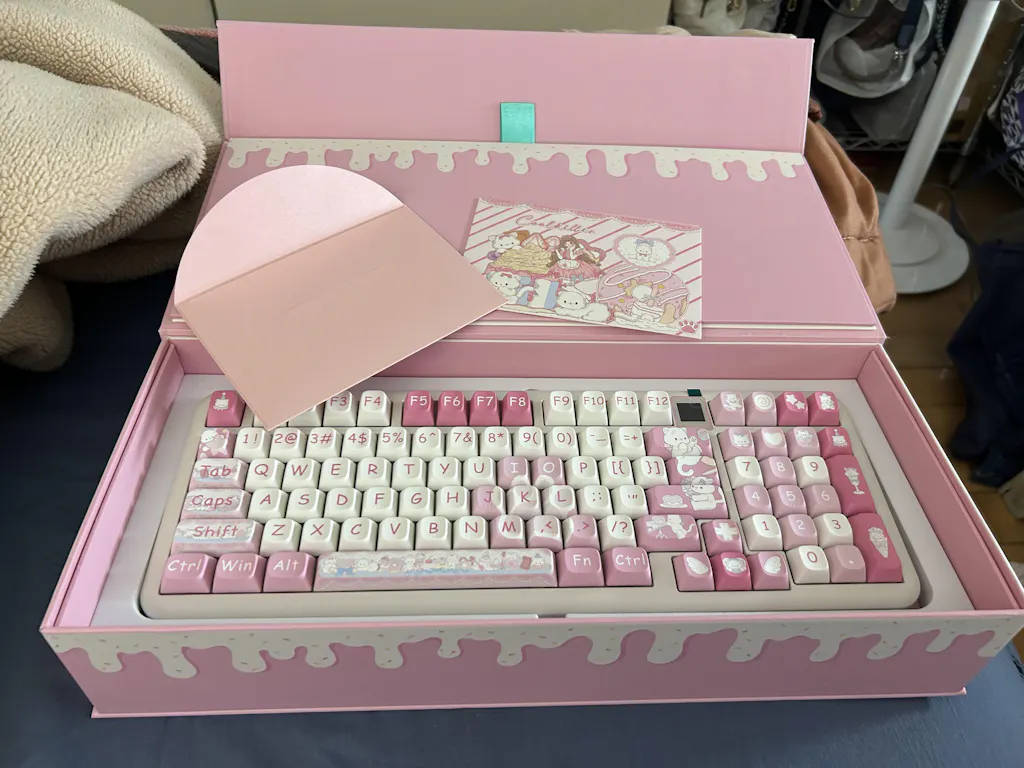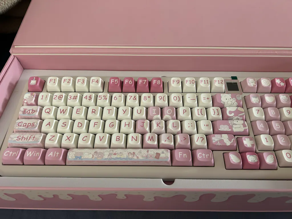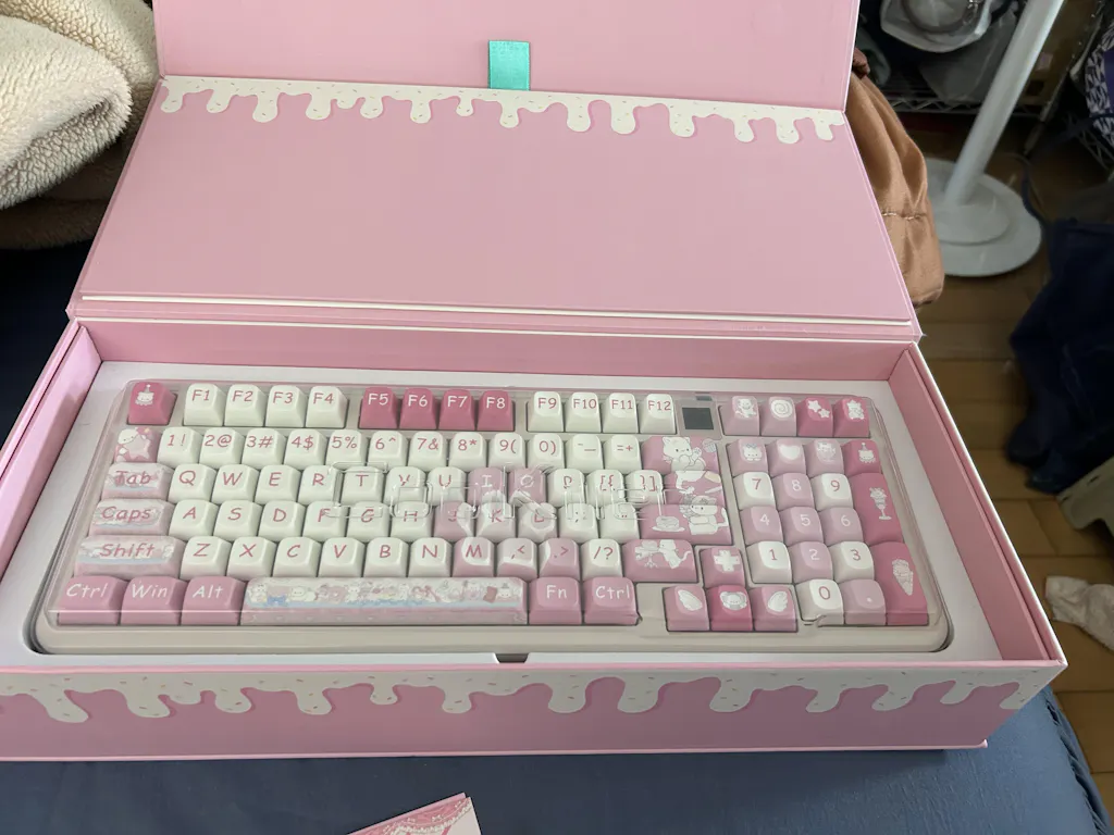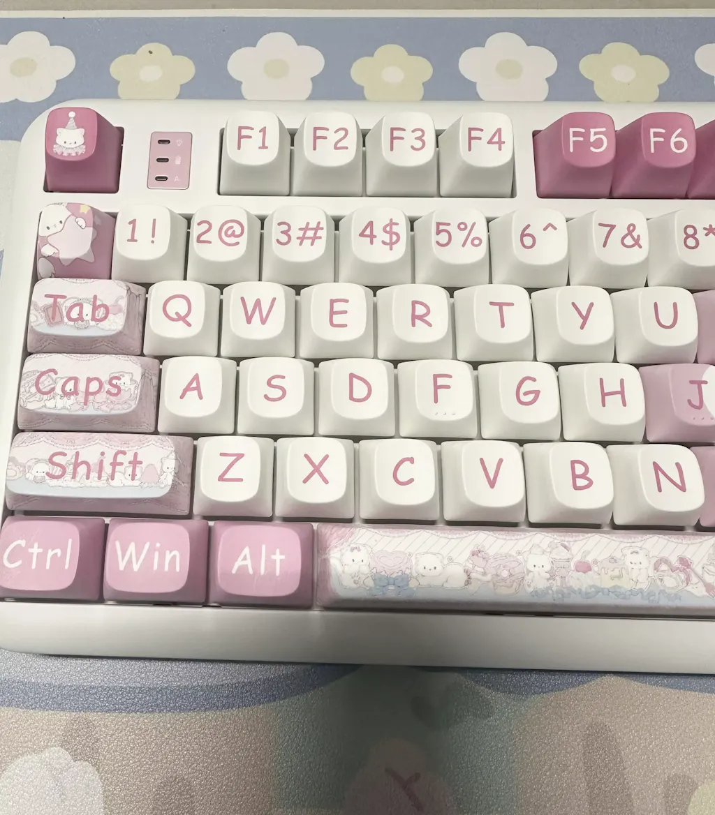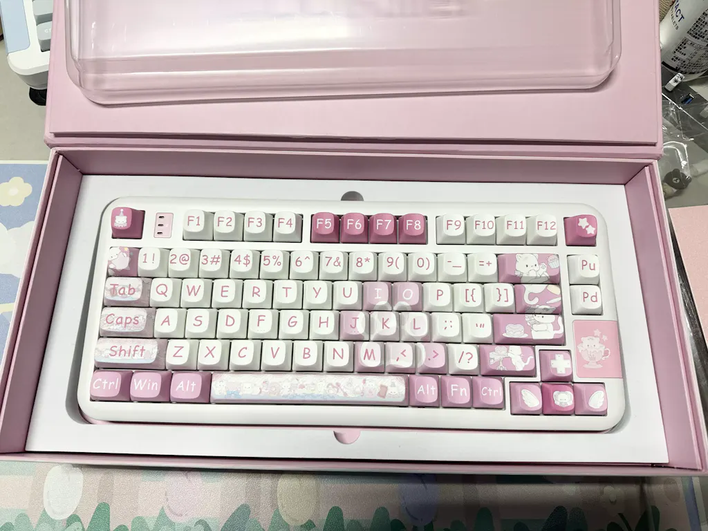 The keyboard arrived just as I expected—super cute! The color isn’t a dull pink, but more of a pink-purple tone that looks really nice. It feels heavy in hand, which suggests solid build quality. The typing sound is also really pleasant. Love it, love it!